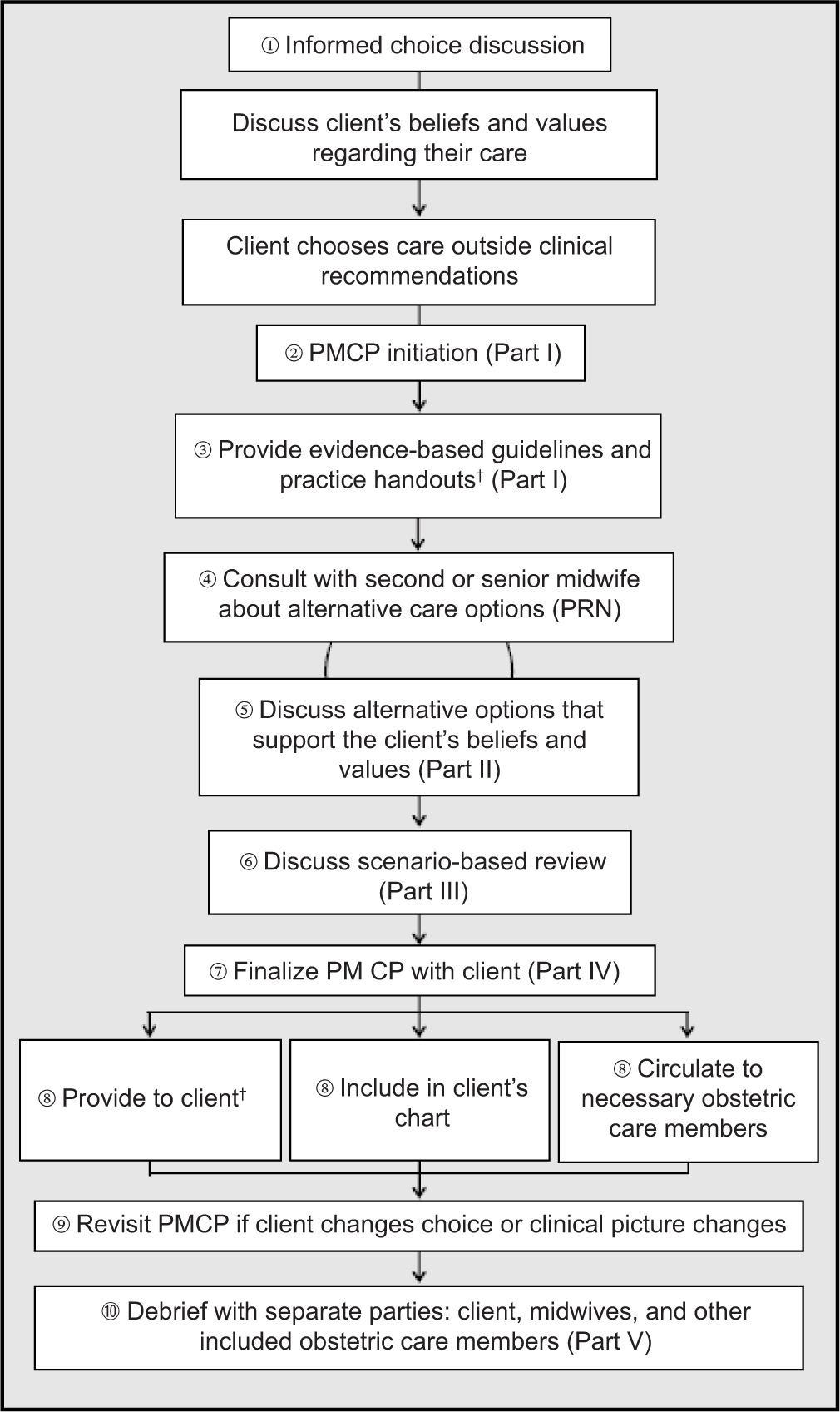 Step 8: Communication and documentation. The PMCP document is then integrated into the client’s chart and shared with relevant care providers. For a client choosing not to use ultrasound in labor and planning a hospital birth, this could be included in the client’s hospital chart, to ensure continuity and reduce misunderstandings during labor.