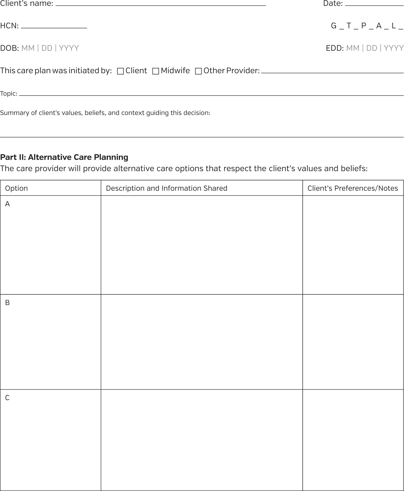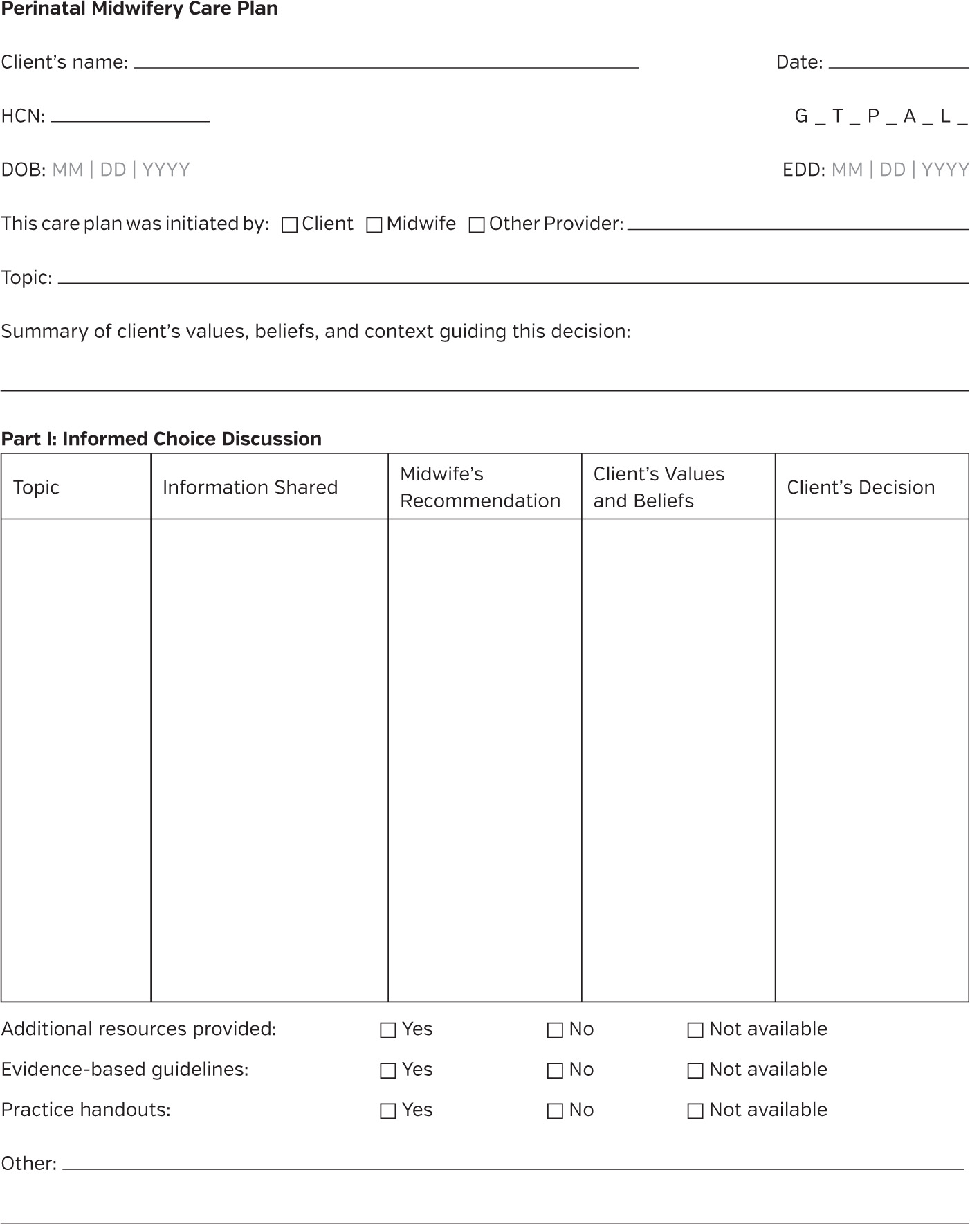 Moreover, the PMCP’s effectiveness as a communication tool is limited in settings where other care providers or institutions do not recognize or engage with it. While system-wide uptake could enhance interprofessional collaboration and continuity of care, the PMCP was developed first and foremost to strengthen midwifery practice and can function effectively as an internal guide and standalone document for midwives.27,30 Even without broader adoption, including the PMCP in the client’s chart can support clarity, documentation, and respectful care planning. In summary, the PMCP offers a structured and ethically grounded approach to navigating informed choice in midwifery care, addressing the challenges midwives face when clients choose care that diverges from recommendations. Its successful implementation does not depend on collective adoption across the healthcare system, though such uptake would be a welcome enhancement.6,11,31,33
