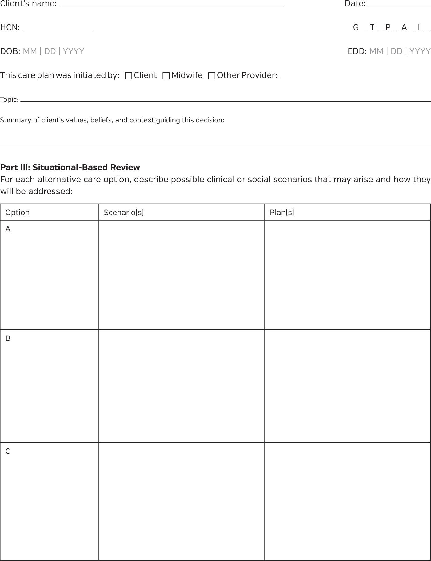 Step 6: Scenario-based discussion. For each alternative care option the client approves, clinical scenarios are explored, such as efficacy of the pinard or fetoscope when using hydrotherapy or indications for ultrasound (e.g., abnormal fetal heart rate on auscultation, labor augmentation with oxytocin, and hospital protocol when using epidural). The responses are discussed and documented in Part III. This supports proactive planning and ensures both parties are prepared for varying outcomes.