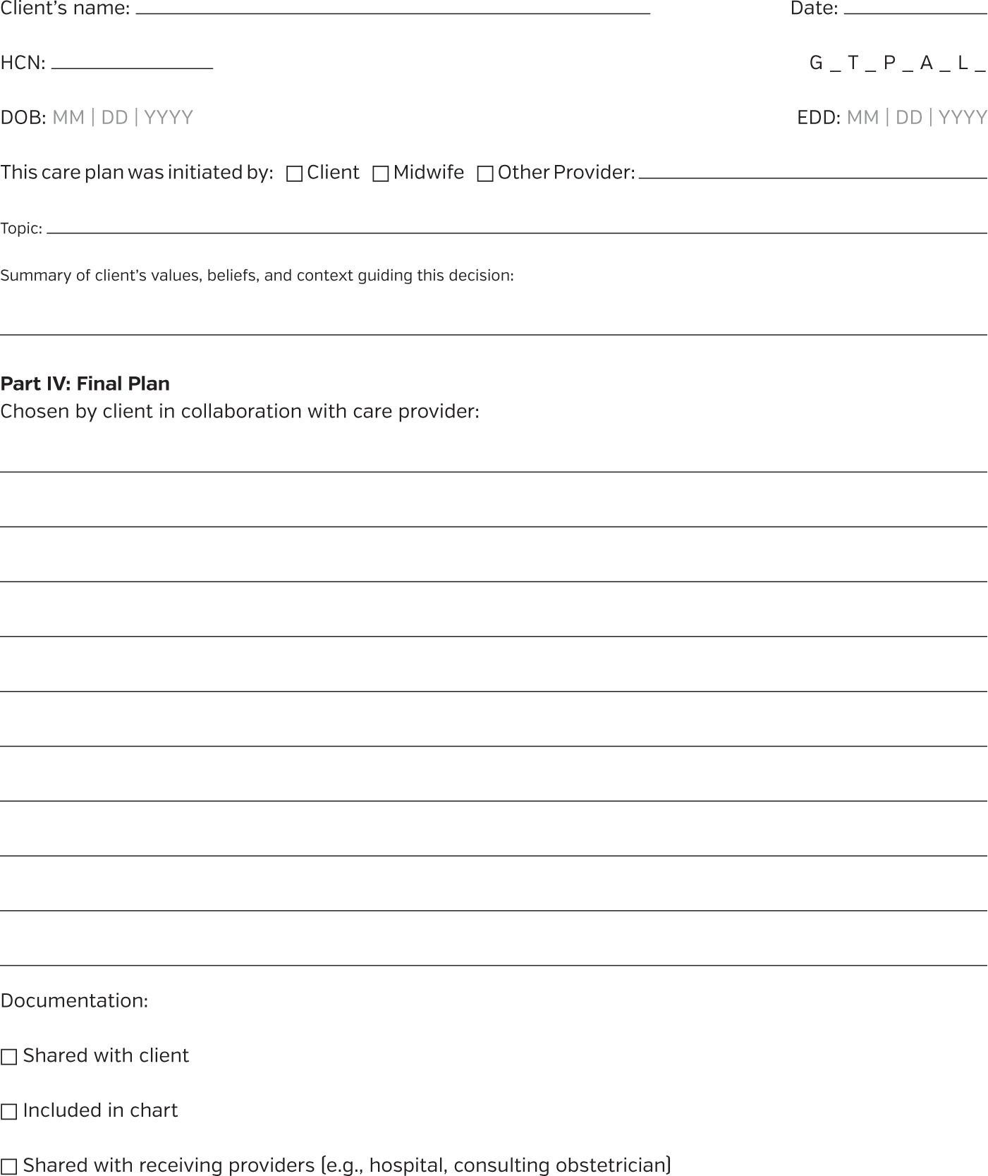 We address this gap by proposing a midwifery-led, Canadian-specific solution: the Perinatal Midwifery Care Plan (PMCP) and its framework. Grounded in the concept of relational autonomy, the PMCP supports transparent, values-based dialogue, and consistent documentation when care diverges from recommendations.