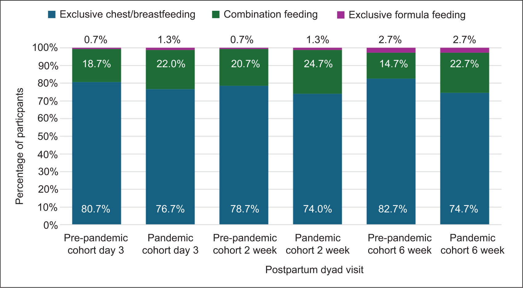 The exclusive chest/breastfeeding rate at 6 weeks postpartum was 82.7% in the pre-pandemic cohort and 74.7% in the pandemic cohort (Figure 1); an 8.0% decline during the pandemic but not statistically significant. The pandemic cohort had an 8.0% increase in combination feeding at 6 weeks postpartum compared to the pre-pandemic cohort. The exclusive formula feeding rate at 6 weeks postpartum was the same for both cohorts at 2.7%. There were no statistically significant differences between cohorts for exclusive chest/breastfeeding, combination feeding, and formula feeding rates at Day 3 and 2 weeks postpartum (Figure 1).