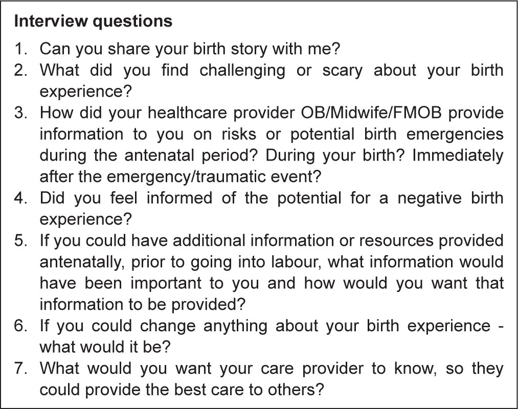 Criteria for participation included having given birth within the previous 5 years and not less than 6 months before the interview date. Participants were required to be 18 years of age or older at the time of the interview. Individuals recruited had antenatal and labour care provided by either: (1) an OB (2) an RM (3) an FMOB or (4) prenatal care by an RM which required transfer of care to an OB before 37 weeks gestation. All participants gave birth at the same tertiary centre in Southern Ontario, or they/their infant were admitted within 24 hours post-delivery to this centre.