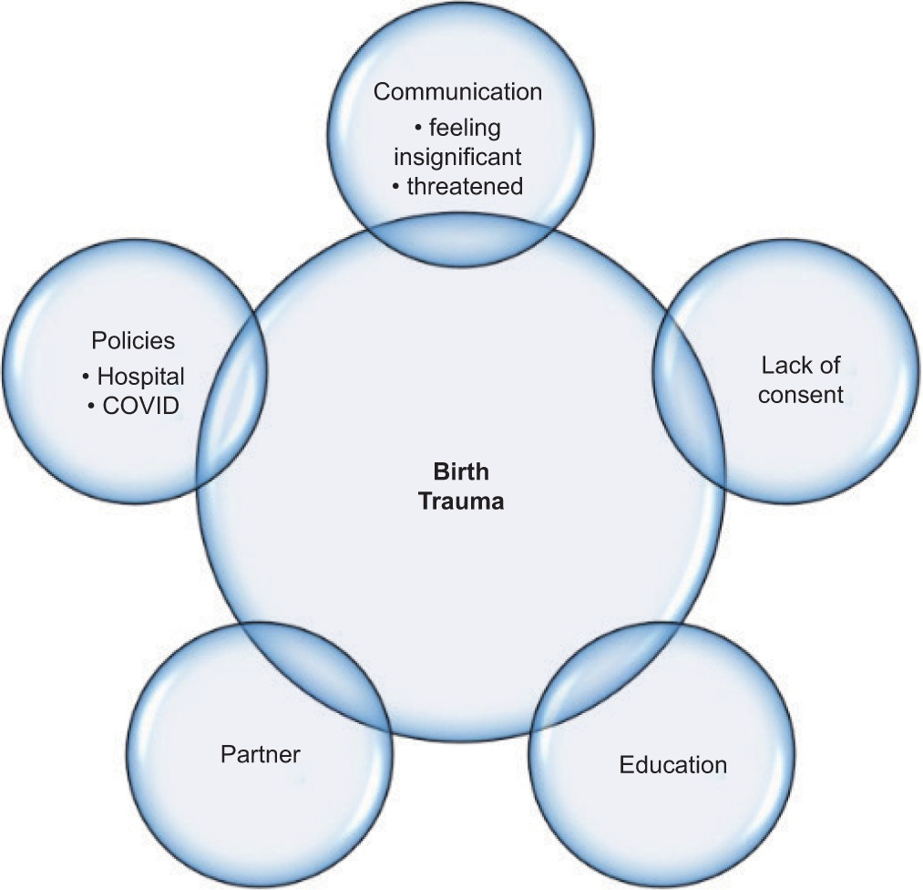 Most participants described their experience concerning COVID restrictions for themselves and their partners, with terms such as alone, horrible, held hostage, had to choose one person, and relating the experience of labouring in a mask to a prisoner labouring in handcuffs. Others commented on the dichotomy of COVID policies which restricted the number of people patients could have as support in their room but when it came to hospital staff there were “about . . . 10 people in the room” (I). Birth trauma themes are illustrated in Figure 3.