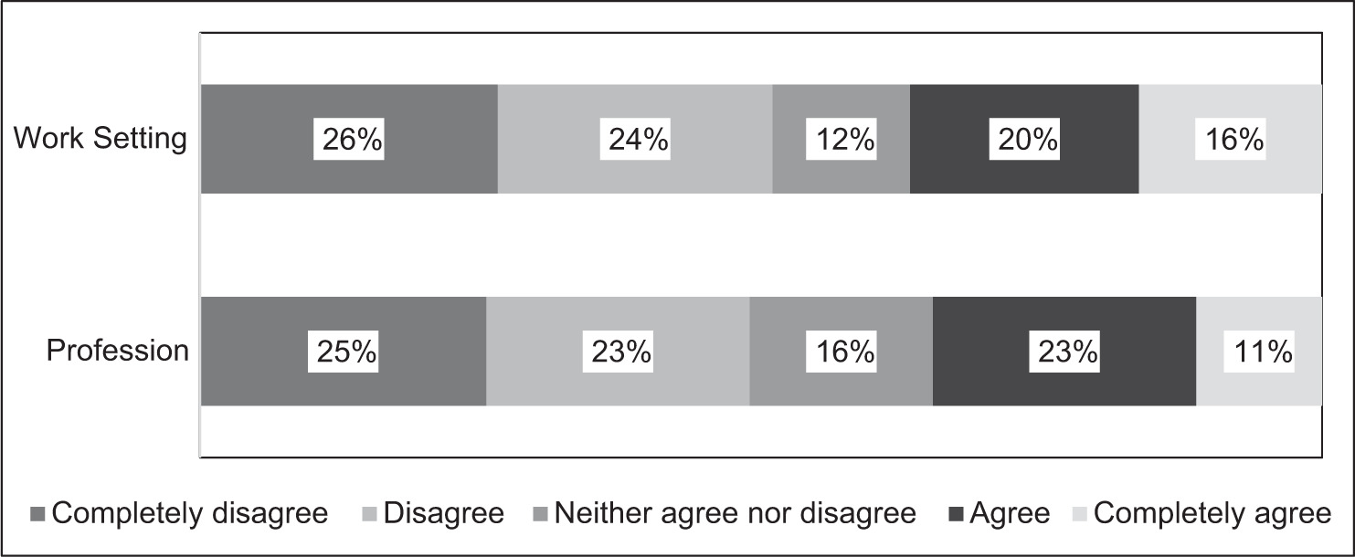Another interesting and important survey finding was regarding midwives’ ‘intention to quit’, where 50% of participants agreed or completely agreed with statements that described their intention to leave their current work setting (organization), while 48% agreed or completely agreed with statements which described their intention to leave the profession. These stark statistics reflect quitting work or leaving the profession as a potential solution to workplace or professional burnout. (Figure 5).
